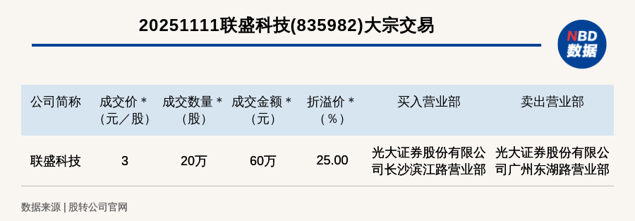 每經(jīng)訊,2025年11月11日,新三板基礎(chǔ)層公司聯(lián)盛科技(835982,收盤(pán)價(jià):2.4元)發(fā)生一筆大宗交易,成交價(jià)3元/股,成交數(shù)量20萬(wàn)股,成交金額60萬(wàn)元,溢價(jià)25%。買(mǎi)入營(yíng)業(yè)部是光大證券股份有限公司長(zhǎng)沙濱江路營(yíng)業(yè)部,賣(mài)出營(yíng)業(yè)部是光大證券股份有限公司廣州東湖路營(yíng)業(yè)部。