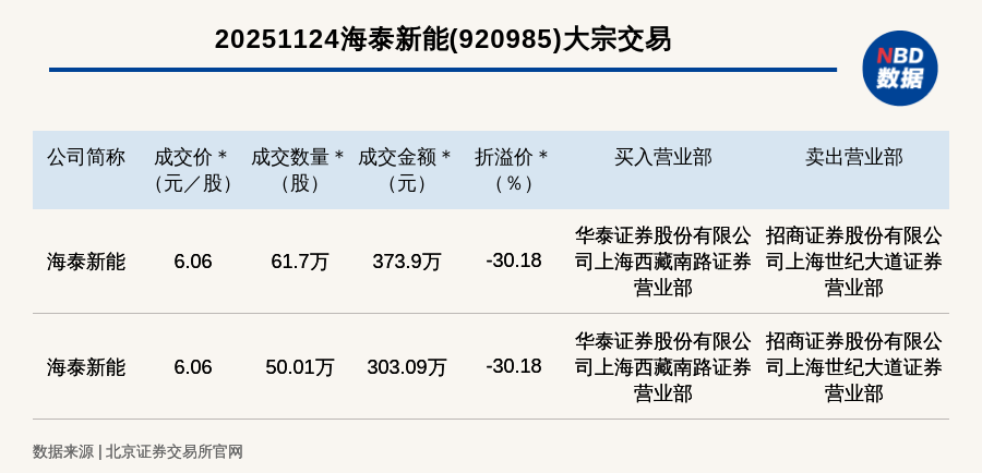 每經(jīng)訊,2025年11月24日,北交所上市公司海泰新能(920985,收盤價(jià):8.68元)發(fā)生2筆大宗交易,總成交金額為676.99萬(wàn)元,成交金額最高的一筆成交價(jià)6.06元/股,成交數(shù)量61.7萬(wàn)股,成交金額373.9萬(wàn)元,折價(jià)30.18%。買入營(yíng)業(yè)部是華泰證券股份有限公司上海西藏南路證券營(yíng)業(yè)部,賣出營(yíng)業(yè)部是招商證券股份有限公司上海世紀(jì)大道證券營(yíng)業(yè)部。