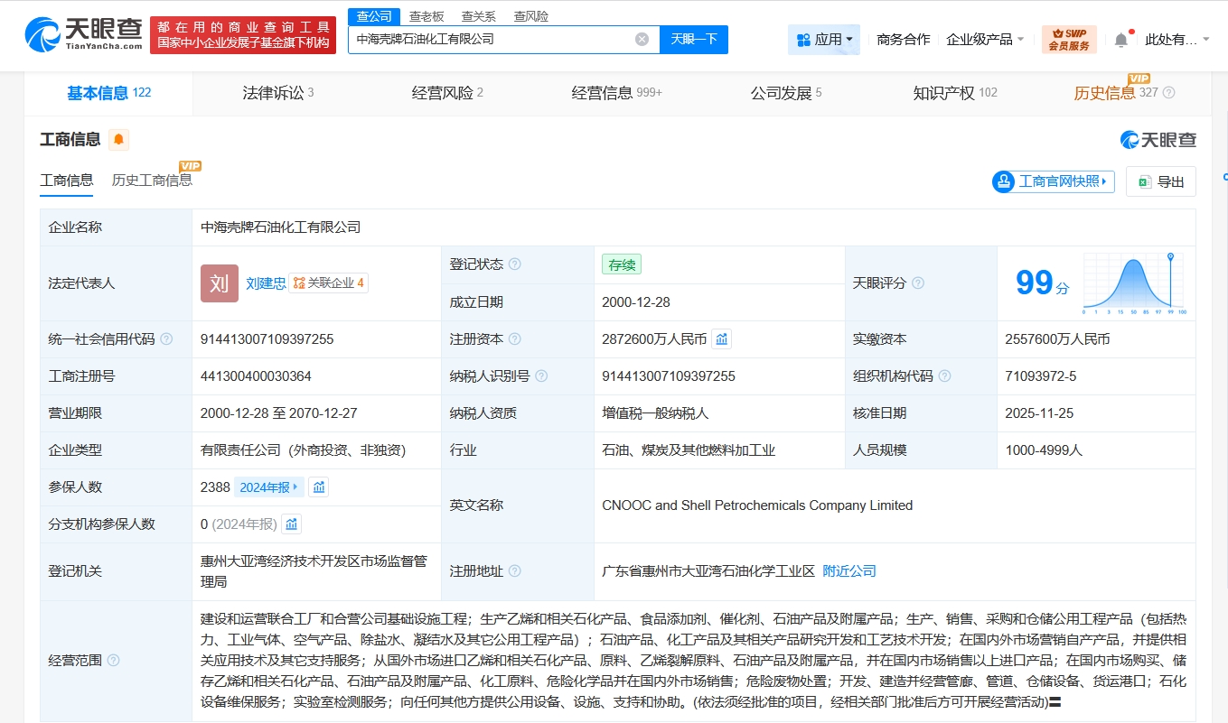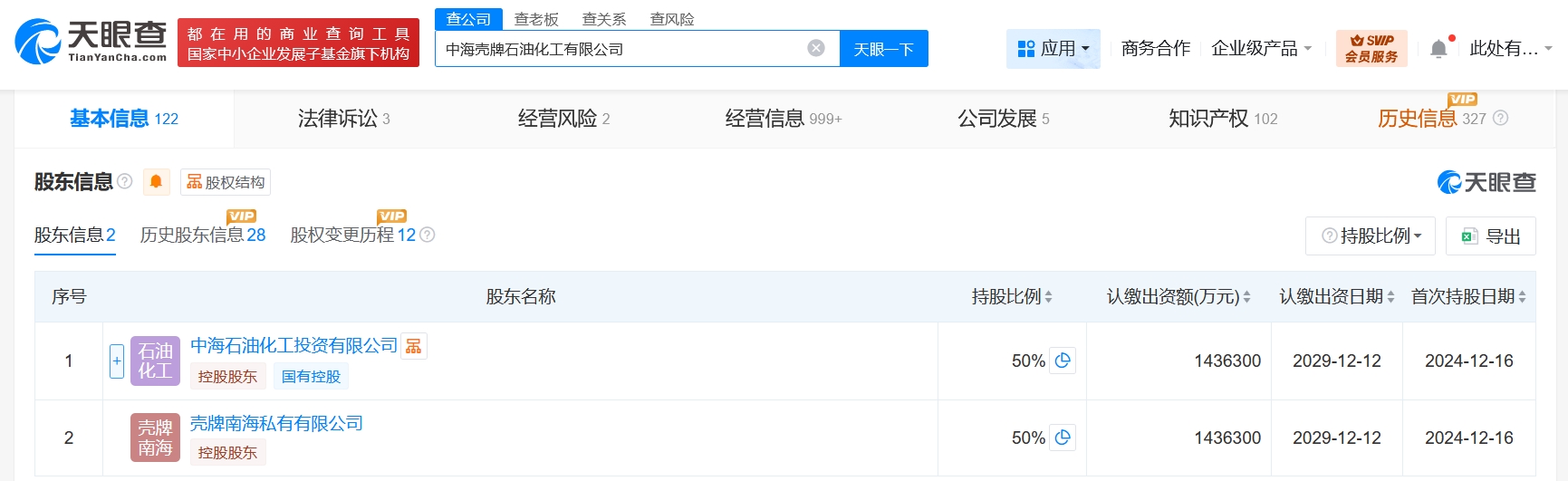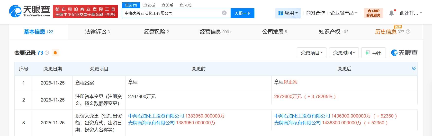 每經(jīng)AI快訊,天眼查工商信息顯示,近日,中海殼牌石油化工有限公司發(fā)生工商變更,注冊(cè)資本由約276.8億元人民幣增至約287.3億元人民幣,增幅約4%。該公司成立于2000年12月,法定代表人為劉建忠,經(jīng)營(yíng)范圍含建設(shè)和運(yùn)營(yíng)聯(lián)合工廠和合營(yíng)公司基礎(chǔ)設(shè)施工程,生產(chǎn)乙烯和相關(guān)石化產(chǎn)品、食品添加劑、催化劑、石油產(chǎn)品及附屬產(chǎn)品,生產(chǎn)、銷售、采購(gòu)和倉(cāng)儲(chǔ)公用工程產(chǎn)品等。股東信息顯示,該公司由中海石油化工投資有限公司、殼牌南海私有有限公司共同持股。