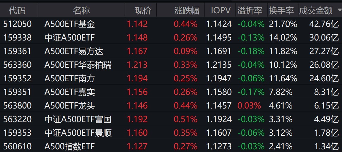 截至上午收盤,場內(nèi)跟蹤中證A500指數(shù)的ETF小幅上漲。其中,有10只中證A500相關(guān)ETF成交額超1億元,3只超27億元。A500ETF基金、中證A500ETF、A500ETF易方達早盤成交額分別為42.76億元、30.06億元、27.27億元。
