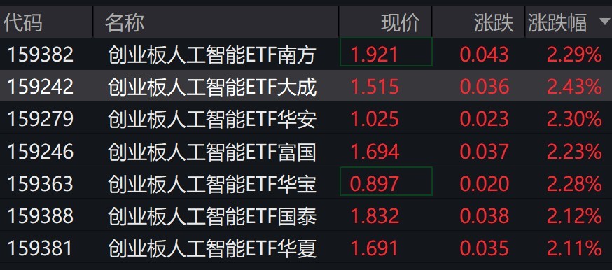 受盤面影響,創(chuàng)業(yè)板人工智能ETF漲超2%。