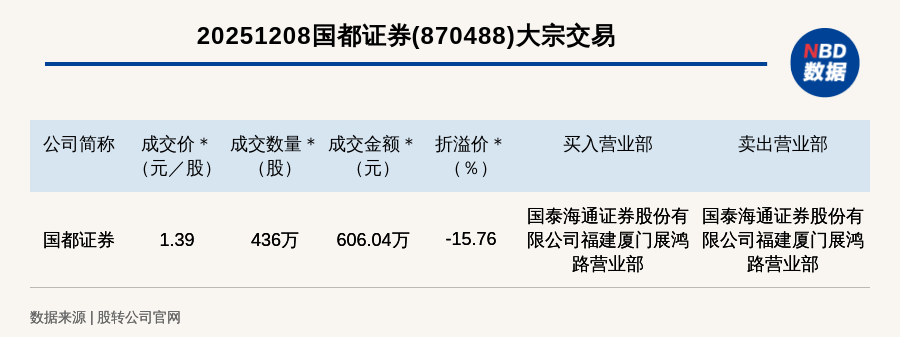 每經訊,2025年12月8日,新三板基礎層公司國都證券(870488,收盤價:1.65元)發(fā)生一筆大宗交易,成交價1.39元/股,成交數量436萬股,成交金額606.04萬元,折價15.76%。買入營業(yè)部是國泰海通證券股份有限公司福建廈門展鴻路營業(yè)部,賣出營業(yè)部是國泰海通證券股份有限公司福建廈門展鴻路營業(yè)部。