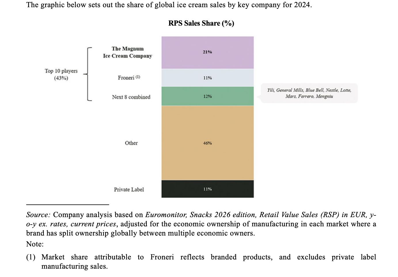由此看來,夢龍冰淇淋公司實(shí)際上是一家發(fā)展已有百年的企業(yè)。根據(jù)夢龍冰淇淋公司招股書,按照2024年銷售額計(jì)算,該公司在全球冰淇淋市場占據(jù)21%的市場份額,位居第一位,緊隨其后的是冰淇淋生產(chǎn)商Froneri,市占率為11%,后續(xù)包括蒙牛、伊利、雀巢、瑪氏等在內(nèi)的8家公司合計(jì)占有12%的市占率。