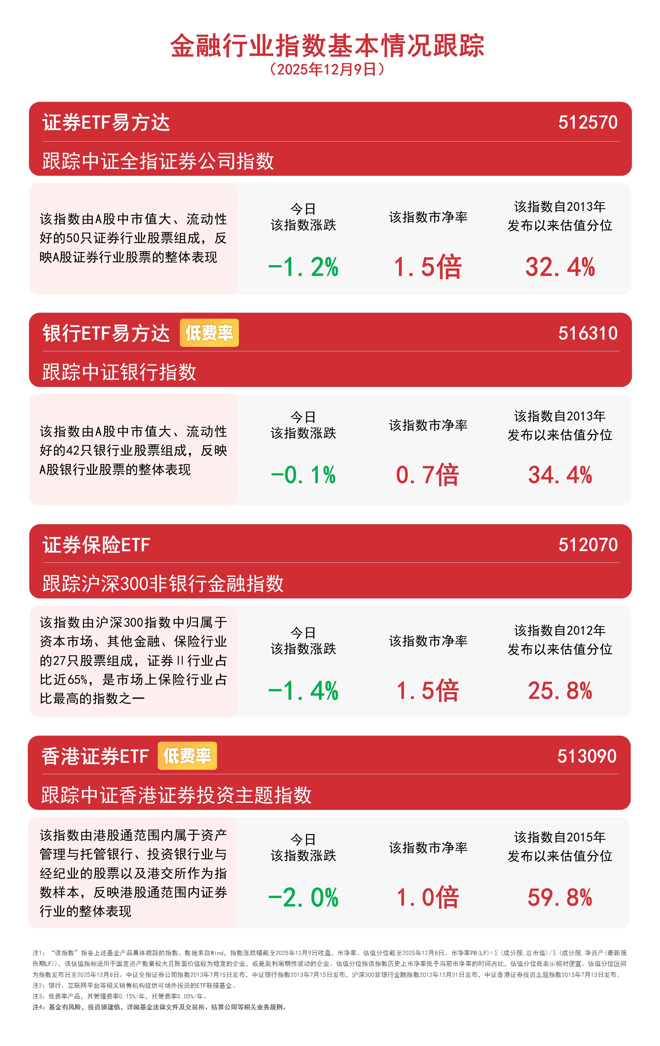 今日,非銀板塊在連漲三日后迎來回調(diào),銀行板塊則延續(xù)窄幅震蕩。指數(shù)層面,中證銀行指數(shù)下跌0.1%,中證全指證券公司指數(shù)下跌1.2%,滬深300非銀行金融指數(shù)下跌1.4%,香港證券指數(shù)下跌2.0%。