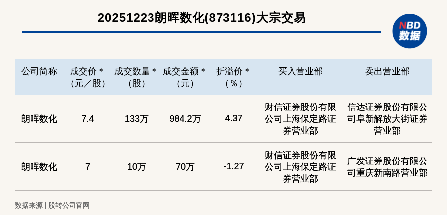 每經(jīng)訊,2025年12月23日,新三板創(chuàng)新層公司朗暉數(shù)化(873116,收盤價:7.09元)發(fā)生2筆大宗交易,總成交金額為1054.2萬元,成交金額最高的一筆成交價7.4元/股,成交數(shù)量133萬股,成交金額984.2萬元,溢價4.37%。買入營業(yè)部是財信證券股份有限公司上海保定路證券營業(yè)部,賣出營業(yè)部是信達證券股份有限公司阜新解放大街證券營業(yè)部。