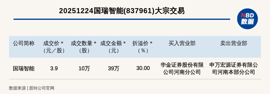 每經(jīng)訊,2025年12月24日,新三板基礎(chǔ)層公司國瑞智能(837961,收盤價:3元)發(fā)生一筆大宗交易,成交價3.9元/股,成交數(shù)量10萬股,成交金額39萬元,溢價30%。買入營業(yè)部是華金證券股份有限公司河南分公司,賣出營業(yè)部是申萬宏源證券有限公司河南本部分公司。