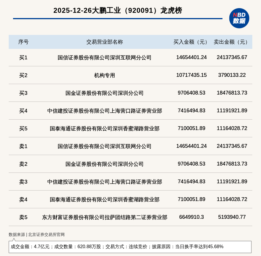 每經(jīng)訊,2025年12月26日,北交所上市公司大鵬工業(yè)(920091,收盤價:77.48元)登上龍虎榜,交易方式是連續(xù)競價,披露原因是當(dāng)日換手率達(dá)到45.68%,成交數(shù)量620.88萬股,成交金額4.7億元。買一席位為國信證券股份有限公司深圳互聯(lián)網(wǎng)分公司,買入1465.44萬元;賣一席位為國信證券股份有限公司深圳互聯(lián)網(wǎng)分公司,賣出2413.73萬元。