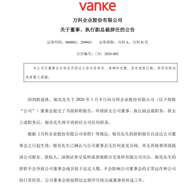 1月8日萬科A公告,郁亮因到齡退休,將于2026年1月8日辭去董事、執(zhí)行副總裁職務(wù)。
