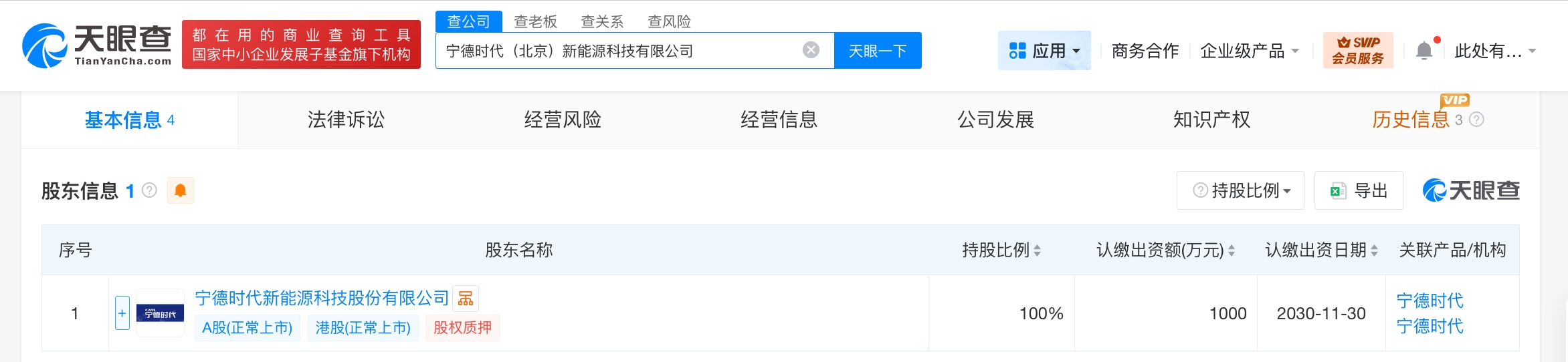每經(jīng)AI快訊,天眼查工商信息顯示,近日,寧德時代(北京)新能源科技有限公司成立,法定代表人為孟祥峰,注冊資本1000萬元人民幣,經(jīng)營范圍含新興能源技術(shù)研發(fā)、工程和技術(shù)研究和試驗(yàn)發(fā)展、電池銷售、信息技術(shù)咨詢服務(wù)、企業(yè)管理咨詢、軟件開發(fā)等。股東信息顯示,該公司由寧德時代(300750)全資持股。