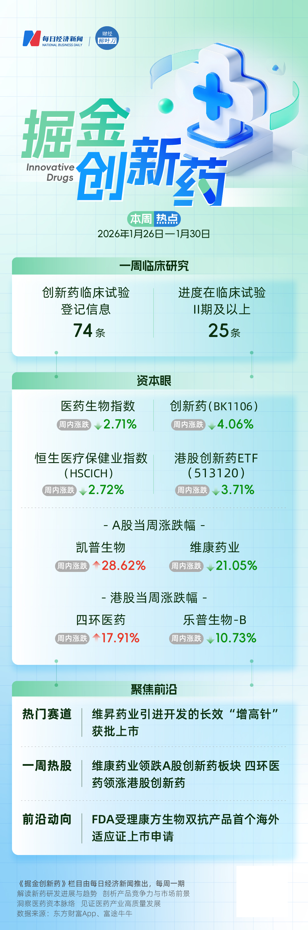 上周(1月26日至1月30日)醫(yī)藥生物指數(shù)跌2.71%,跑輸上證指數(shù),創(chuàng)新藥相關(guān)指數(shù)領(lǐng)跌,或因利好效應(yīng)失效、年報業(yè)績暴雷等。個股分化加劇,短期板塊或延續(xù)震蕩。新股方面,普祺醫(yī)藥沖刺港股IPO,公司暫無產(chǎn)品獲批。維昇藥業(yè)長效“增高針”獲批,F(xiàn)DA受理康方生物雙抗產(chǎn)品海外上市申請。歸創(chuàng)通橋董事長趙中認(rèn)為未來三至五年,國產(chǎn)醫(yī)療器械市場份額有望過半。