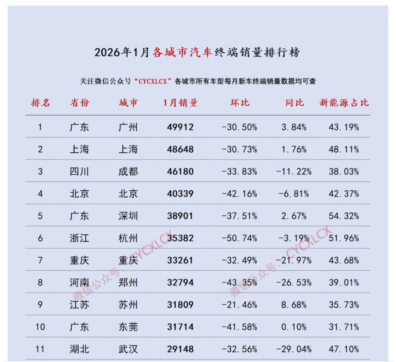 2026年1月,廣州、上海和成都以突破4.5萬(wàn)輛的月銷成績(jī),構(gòu)成當(dāng)月各城市汽車銷量排行榜上的第一梯隊(duì),在其之后的北京(4.03萬(wàn)輛)和深圳(3.89萬(wàn)輛)分列第四、五位。