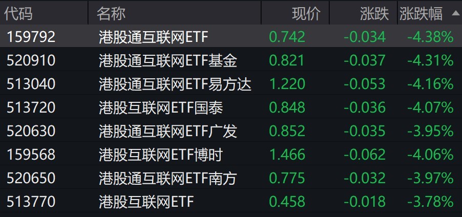 受盤面影響,港股通互聯(lián)網(wǎng)相關(guān)ETF跌約4%。