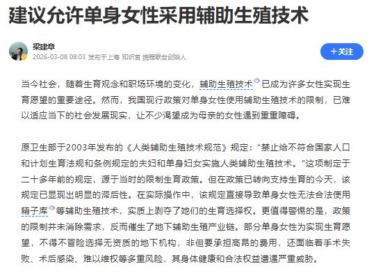 3月8日,攜程聯(lián)合創(chuàng)始人、人口經(jīng)濟學(xué)家梁建章發(fā)布《建議允許單身女性采用輔助生殖技術(shù)》一文。