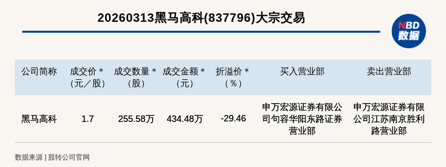 每經(jīng)訊,2026年3月13日,新三板創(chuàng)新層公司黑馬高科(837796,收盤價(jià):2.41元)發(fā)生一筆大宗交易,成交價(jià)1.7元/股,成交數(shù)量255.58萬股,成交金額434.48萬元,折價(jià)29.46%。買入營業(yè)部是申萬宏源證券有限公司句容華陽東路證券營業(yè)部,賣出營業(yè)部是申萬宏源證券有限公司江蘇南京勝利路營業(yè)部。
