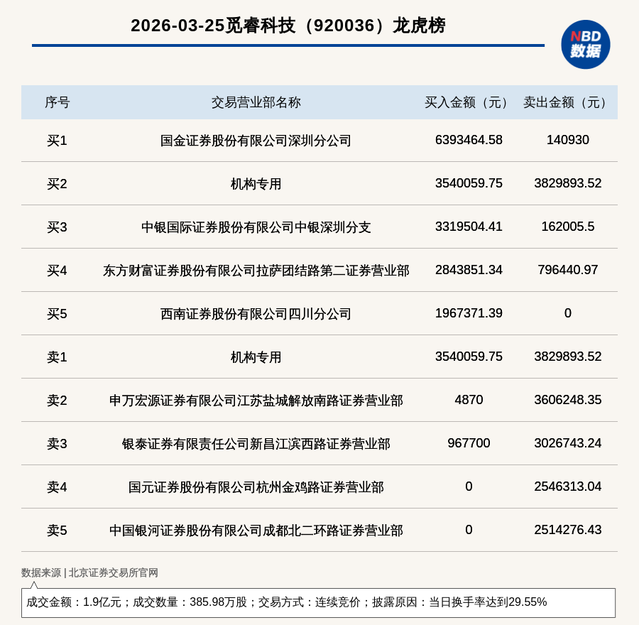 每經(jīng)訊,2026年3月25日,北交所上市公司覓睿科技(920036,收盤價:50.46元)登上龍虎榜,交易方式是連續(xù)競價,披露原因是當(dāng)日換手率達(dá)到29.55%,成交數(shù)量385.98萬股,成交金額1.9億元。買一席位為國金證券股份有限公司深圳分公司,買入639.35萬元;賣一席位為機(jī)構(gòu)專用,賣出382.99萬元。