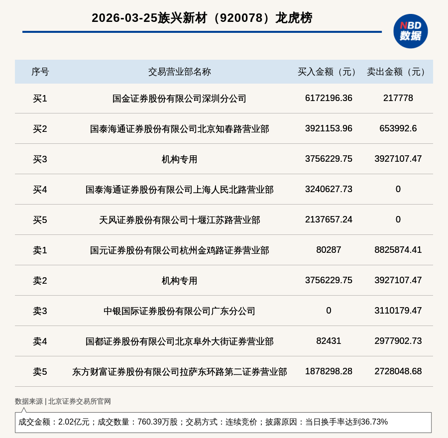 每經(jīng)訊,2026年3月25日,北交所上市公司族興新材(920078,收盤價:26.17元)登上龍虎榜,交易方式是連續(xù)競價,披露原因是當(dāng)日換手率達(dá)到36.73%,成交數(shù)量760.39萬股,成交金額2.02億元。買一席位為國金證券股份有限公司深圳分公司,買入617.22萬元;賣一席位為國元證券股份有限公司杭州金雞路證券營業(yè)部,賣出882.59萬元。