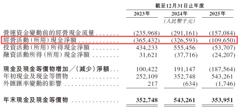 與巨額賬面虧損同步出現(xiàn)的,是公司主營業(yè)務(wù)經(jīng)營活動現(xiàn)金流的持續(xù)承壓。報告期內(nèi),星環(huán)科技經(jīng)營活動產(chǎn)生的現(xiàn)金流量凈額分別為-3.65億元、-3.27億元和-1.1億元,三年間共計凈流出8.02億元資金。