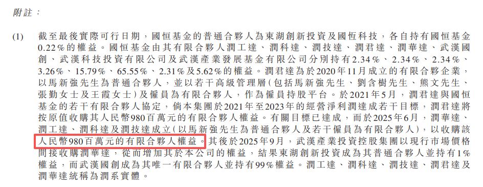 招股書披露,2021年5月,潤君達(dá)與國恒基金的若干有限合伙人達(dá)成協(xié)定,規(guī)定如果華工科技在2021年至2023年期間的經(jīng)營凈利潤達(dá)成特定目標(biāo),潤君達(dá)將按原值收購其9.8億元的有限合伙人權(quán)益。相關(guān)業(yè)績目標(biāo)達(dá)成后,馬新強(qiáng)及若干員工于2025年6月成立了新的潤系實體,收購了該筆9.8億元的有限合伙人權(quán)益。