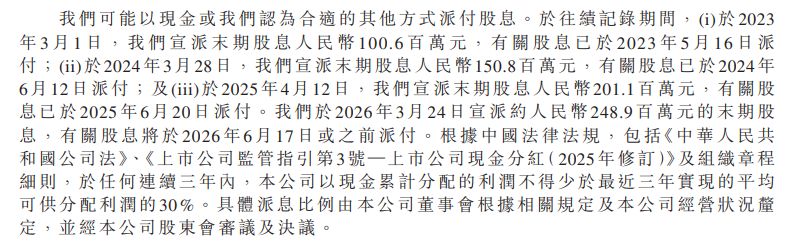 歷史財務(wù)資料顯示,華工科技近年來保持了持續(xù)的大額派息節(jié)奏。2023年3月,公司宣派末期股息1.01億元;2024年3月,公司宣派末期股息1.51億元;2025年4月,公司進(jìn)一步宣派末期股息2.01億元。就在此次遞表前的2026年3月24日,公司再次宣派了高達(dá)2.49億元的末期股息,該筆款項定于2026年6月17日或之前派付。在短短四年間,華工科技累計向現(xiàn)有股東派發(fā)了超過7億元的現(xiàn)金紅利。