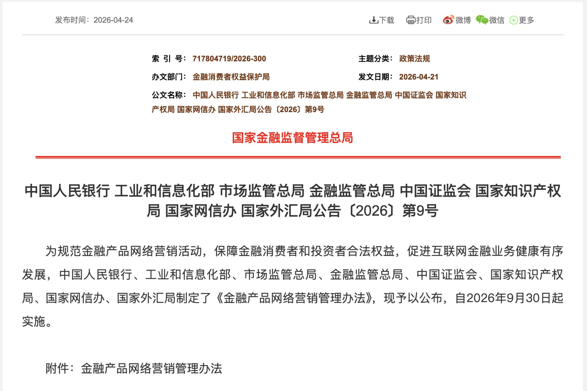 4月24日八部門聯(lián)合發(fā)布《金融產(chǎn)品網(wǎng)絡(luò)營銷管理辦法》,要求金融產(chǎn)品網(wǎng)絡(luò)營銷不得虛假宣傳、誘導(dǎo)消費,金融機(jī)構(gòu)要承擔(dān)管理責(zé)任?!掇k法》明確除金融機(jī)構(gòu)等外,其他組織或個人不得開展金融產(chǎn)品網(wǎng)絡(luò)營銷,提出“八不準(zhǔn)”,規(guī)定金融機(jī)構(gòu)及其委托的第三方互聯(lián)網(wǎng)平臺開展?fàn)I銷必須在許可范圍內(nèi),定于2026年9月30日起實施。
