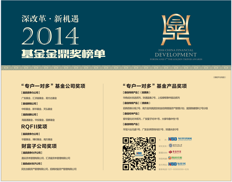 “金鼎獎” 作為《每日經(jīng)濟(jì)新聞》全力打造的核心品牌活動之一,已經(jīng)成功舉辦四屆,其憑借專業(yè)、權(quán)威的評選標(biāo)準(zhǔn)得到了社會各界的廣泛 關(guān)注與認(rèn)可,成為冬季中國金融行業(yè)最受矚目的大事記。今年,《每日經(jīng)濟(jì)新聞》繼續(xù)聯(lián)合權(quán)威學(xué)術(shù)單位,運(yùn)用科學(xué)的模型和研究方法,為 中國高端投資者提供一份公正、權(quán)威的金融產(chǎn)品、品牌和團(tuán)隊(duì)機(jī)構(gòu)的榜單。