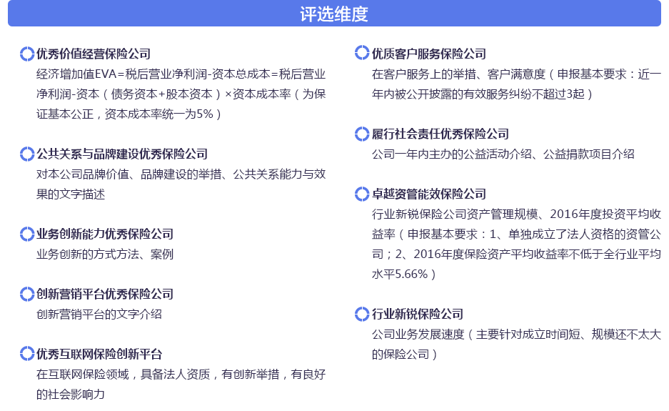 本次評選將秉持客觀真實、公正透明、范圍廣泛的原則,以“第5個保險公眾宣傳日”活動為契機,再次將視角聚焦于新生態(tài)環(huán)境下中國保險業(yè)最具經(jīng)營智慧的風云企業(yè),力求準確把握保險風云脈絡。榜單以壽險、產(chǎn)險、資管為經(jīng)度,以經(jīng)營理念、品牌建設、業(yè)務創(chuàng)新、客戶服務、償付能力、社會責任、資管能效為緯度來設置獎項。