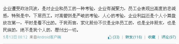 昨日(5月13日)上午,葛文耀發(fā)的一條微博稱,企業(yè)正遭受一場(chǎng)風(fēng)波,“是對(duì)企業(yè)和員工的一種考驗(yàn)……于我而言,家化股份不僅是全體員工的,也是全體股東,也是民族的,絕不是我個(gè)人的,愿付出一切。”