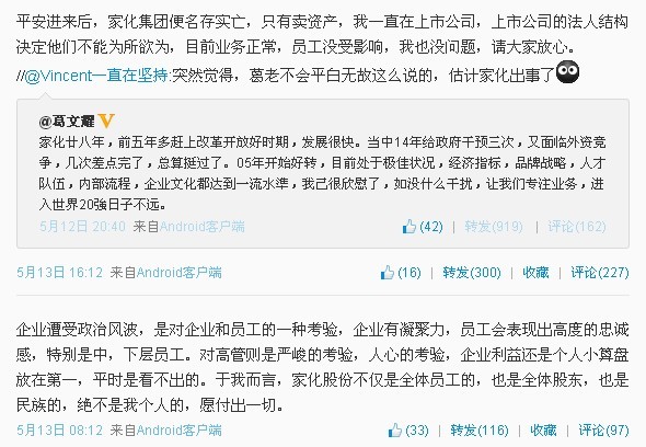 昨日下午,葛文耀發(fā)的另一條微博中,將矛頭直指大股東平安集團(tuán):“平安進(jìn)來后,家化集團(tuán)便名存實(shí)亡,只有賣資產(chǎn),我一直在上市公司,上市公司的法人結(jié)構(gòu)決定他們不能為所欲為……”