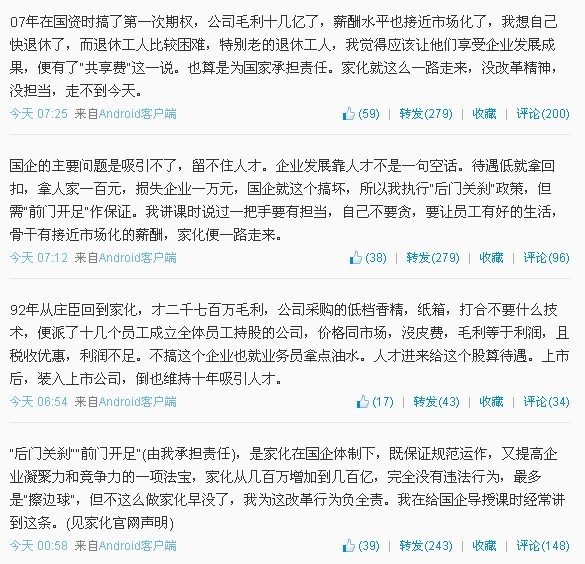 “企業(yè)退休職工工資低是中國(guó)社保制度一大問題。2007年家化經(jīng)濟(jì)效益開始明顯好轉(zhuǎn),我便開始解決退休職工的‘共享費(fèi)’(讓退休員工也享受企業(yè)發(fā)展成果,每月發(fā)幾百元生活補(bǔ)貼)。”5月9日凌晨,葛文耀曾在其個(gè)人微博中描述“共享費(fèi)”,對(duì)其首次進(jìn)行公開。【更多】
